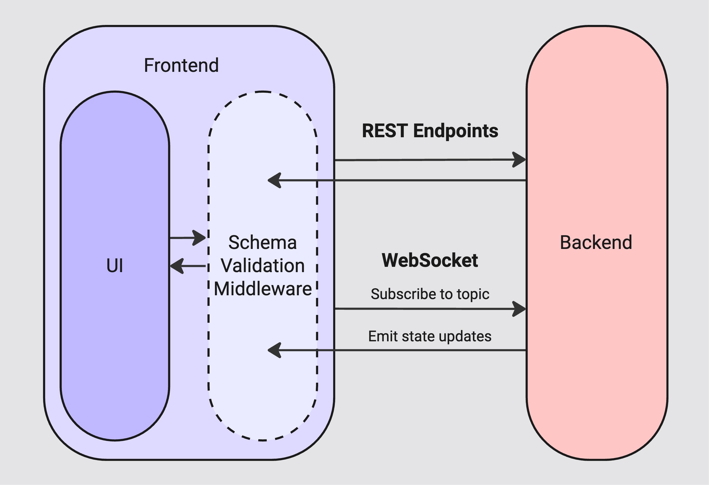 To decouple development and support rapid iteration, I worked with the back-end team to define a hybrid interface consisting of REST endpoints and a topic-based WebSocket pub/sub model to support. This allowed the front end and back end to work in parallel while adhering to a shared schema.